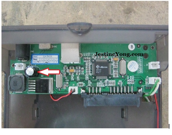 The moment I slide the whole thing out, I saw a bulged capacitor near the power jack. It was 680uf/16 volts.