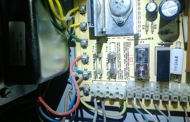 You can see below the internal parts of the unit. The two missing fuses are: just above the big 5V regulator the first one, rated 1,6A and used for the protection of the electromagnetic mechanism of the entry door along with the secondary winding of 12V A.C of the power transformer which feeds it. This secondary winding is connected with the two grey color cables in the PCB. The second one, rated 1A, protects the one half of the primary winding and is located just below that regulator, at its left corner. Also the one at its right side has the same rating as the previous one and protects the second half of the primary winding. There are no more fuses on this PCB.
