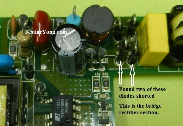 I concluded that at that very moment only the diodes and the fuse were at fault. Usually when I found one or two bridge diodes shorted I would replace the four of them. If not I’m sure later on (perhaps in few months’ time) the other two bride diodes may give way too.
