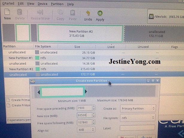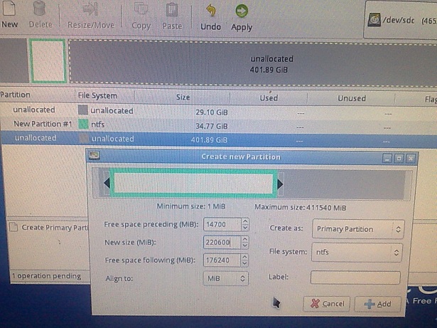 Because the disk starts with bad area I added this to ‘freespace preceding’, so it won’t end up in any partition and added the first good area to ‘new size’ so it becomes the first partition.