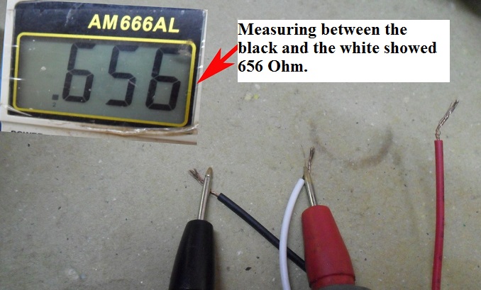 Next, place the black probe to black wire and red probe to white wire and I got 656 Ohm.