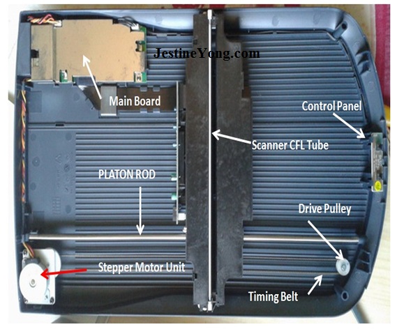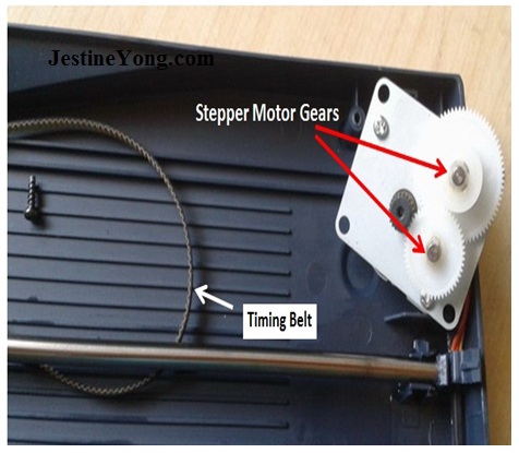 Now I have cleaned everything inside the scanner but while moving the Scanner Unit I found the unit moving on the Platen Rod was not smooth hence I cleaned the platen rod with isopropyl alcohol and then applied little machine oil and white grease on platen Rod. I also lubricated the timing belt pulley and stepper motor Gears.