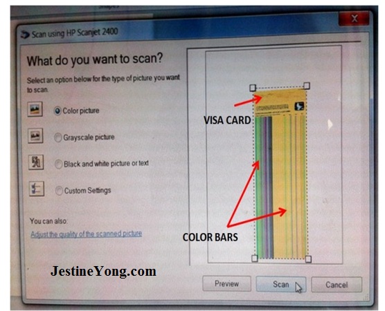 A customer came to my workshop with his HP 2400 Flatbed Scanner unit stating the problem; while he is scanning anything he is getting some “COLOR BARS” on the scan image. I put one scrap visa card in the scanner and when scanned the image I found the same problem as stated by the customer.