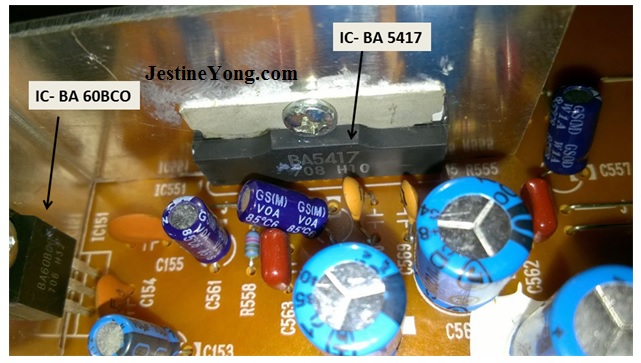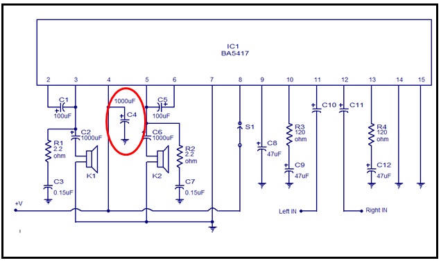 So I have downloaded IC data from the internet for reference for IC BA 5417 and I have decided to test the capacitors which are directly grounded from IC (Because I am getting Humming from both the speakers if you get humming from only one speaker then test respected output pins i.e. pin number 2-3 and 5-6) so I have started with big capacitor which is connected to pin no 4 and 8 which is supply voltage to IC.