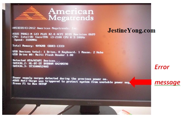 I was called by a co-worker because her PC was restarting continuously and a message was shown in Display: Power supply surges detected during the previous power on. ASUS Anti-Surge was triggered to protect system from unstable power supply unit! Press F1 to Run Setup.