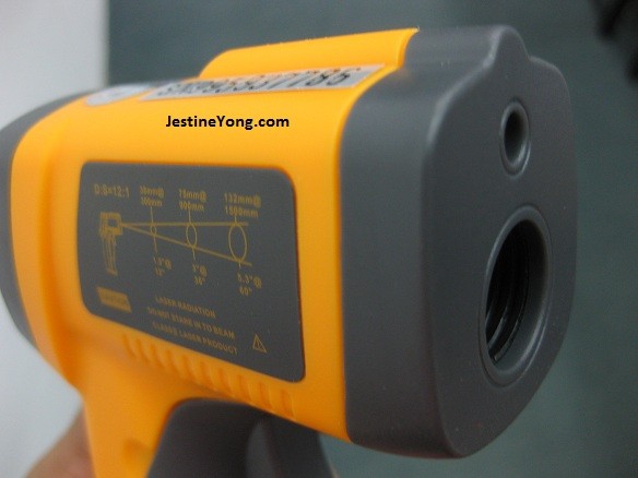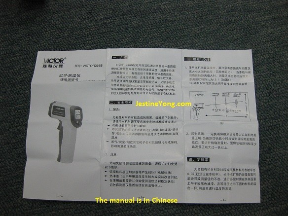 Since I just got this Victor Infrared thermometer today I have not fully tested this meter yet. It came with a manual (in Chinese) and without the 9 volt battery. You can select to enable /disable the laser beam. You also could select either Celsius or Fahrenheit. Below are the photos of the meter: