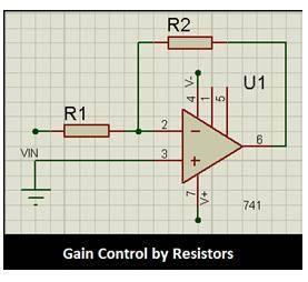 An operational amplifier is used to increase the input voltage by a specific ratio known as “gain”.The gain of the operational amp is defined as output voltage divided by input voltage. The gain of 741 op amp can vary from100,000 to over 1 million. Gain requirement depends upon usage; varying from project to project. A very high gain systemcan become easily unstable and may give false output to a very small change in input due to some physical abnormality. So it is necessary to control the gain of 741 Op Amp somehow. One method to control the gain is using two resistors R1 and R2 as shown in following figure.