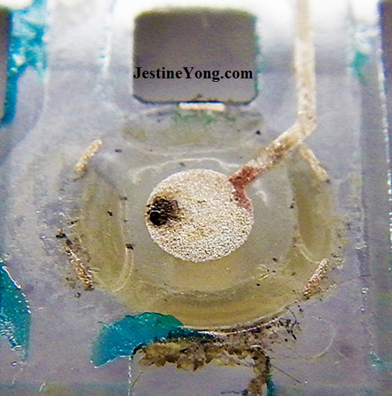 This is a pad with corroded wire and a black point on the left side, which is a corroded point too. This pad will be completely destroyed in a short time.