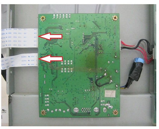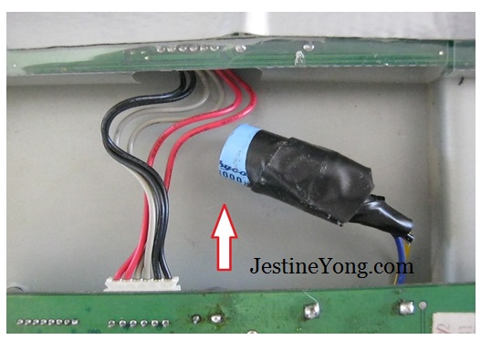 I saw this capacitor sitting on the metal of the LCD case. This is a dangerous thing to do. What if the electrical tape came off and then it touched the metal part of the LCD screen? That would short it out and it might cause a big damage inside.