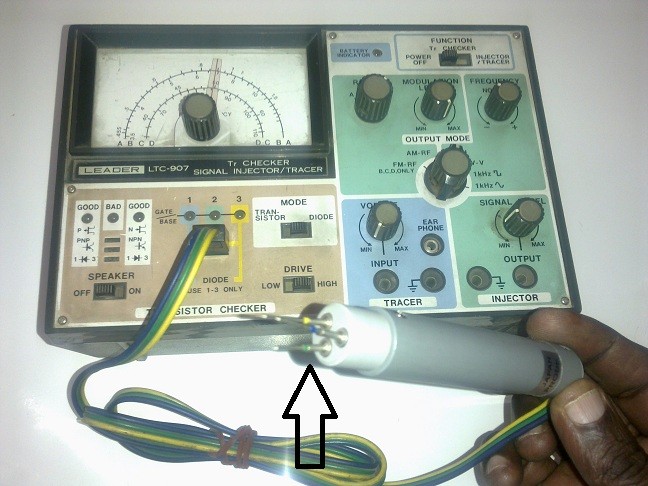 He recently sent to me the photo of where the probe belong to (see the below photo). It was from the Leader LTC-907 transistor tester. Now you can’t find such tester in the market. I was wondering if such tester is accurate in testing transistors? If any of the reader here own one please do share your experience-thanks. By the way if there is such a probe in the market I would like to get one and I find it to be good especially in checking the 3 pins SMD components.