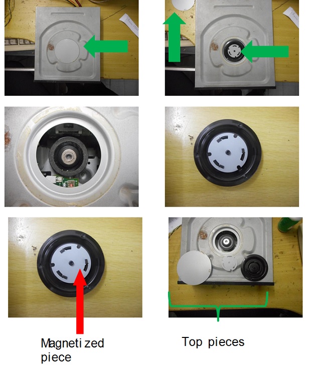 The device was dismantled in the top (of course, in this kind of model) till get to the mechanism. The clue is to find the magnetized piece due to the magnetic top that pushes the disc onto the motor rotor wheel (the permanent Magnet has often just become too strong to elevate and free the disc) will not leave each other.