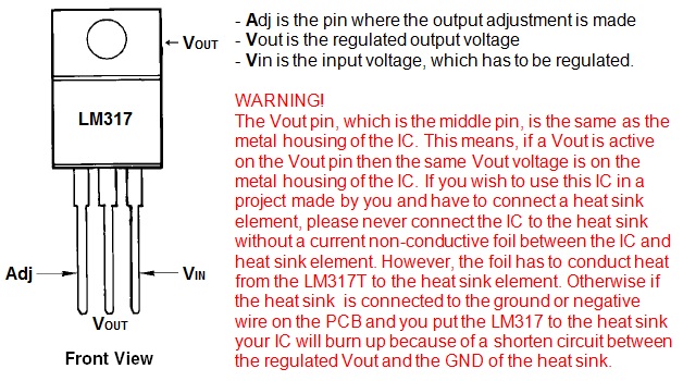 The LM317 is a three pin voltage regulator, which comes in different package and different load current up to 1.5A. For a higher load, the regulator must be equipped with a passive or active heat sink to cool down the temperature of the IC.