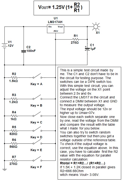 If you build the above simple circuit, you can test your LM317 easily. Close one desired switch, read the output voltage and compare with this table.