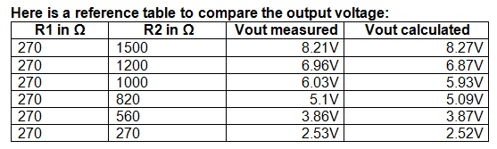 If you close on same time more then one switch then you have to manual calculate the R2 value with the parallel resistance equation first, and then use the above equation to calculate the output voltage and compare the result with the output voltage shown by your DMM. In your calculations and measurement you will get some small differences, this is because the tolerance of the resistors, the LM317 and the precision of the DMM. Don’t worry about that, that is normal and is around +-5%.