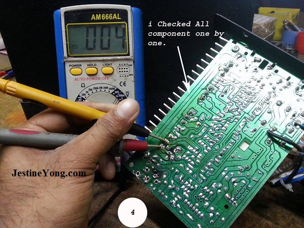 There are couple of transistors and resistors that were burnt and shorted. If you wish to learn how to test electronic components, you can check out this website
