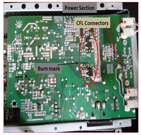 On visual inspection I found burning marks on PCB. It was on the high voltage transformer area.