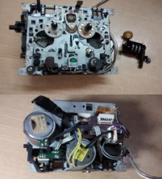 One point to be noted in this set is that, in order to remove the PCB, after unscrewing from the rear and bottom, you have to tilt the back panel backwards as it is designed in such a way. See the third picture from the bottom. Without this, the PCB will not come out! You should not miss that the mechanism uses two motors, one for play and another for FF/REW. All functions are by feather touch controlled by a microprocessor.