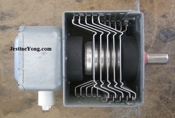 I am sure you have seen this before. This is the microwave magnetron that produces heat once it gets enough power. Without this, the microwave oven is not an oven. I found this piece to be faulty and it had to be replaced. Make sure you discharge the main capacitor before you replace it otherwise, you will get shocked even if the microwave oven was not plugged in power.