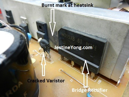 Actually there are two circuit boards-one is the high voltage board and the other one is the power supply board. Since the complaint was no power so I concentrate on the power supply board. The first thing to check was the main fuse and it was tested good. There were no bulged electrolytic capacitors and while trying to search for any burn component I found a component marked as TH1 already cracked and hardly could see the whole part number. This component is a Thermistor while to some they refer to is as Thermister. Not only that, the heatsink located just behind the Thermistor had a burnt mark caused by the great spark of the Thermistor when it was exploded most probably due to the excessively high inrush current. Just to let you know that one of the main function of a Thermistor is to used as inrush current limiter.