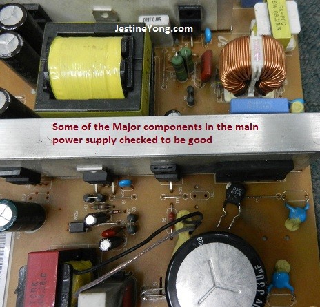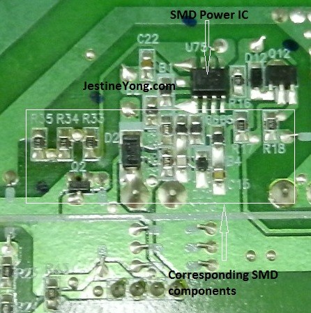 In my case, I did checked on the power FET, primary winding of the transformer and secondary diodes and all of these components were tested good. I’d also put special attention on the SMD power IC to see if there is any tiny burnt mark on the surface of the IC with the help of my X35 magnifying glass. Well, the SMD IC and the surrounding SMD components were in good condition too.