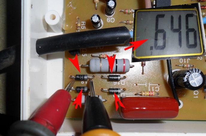 I thought one of the bridge diodes should have shorted causing the resistor to open circuit but my guess was wrong because all the four diodes were tested good. One of the diodes reading was .646 which means it was good-see the photo below. Even checking on other major components did not show any bad/shorted components in the circuit.