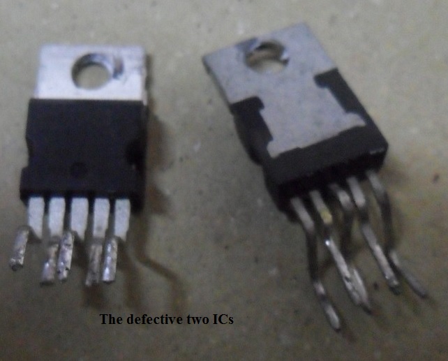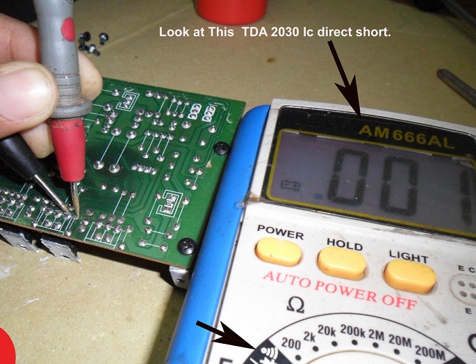 Next I powered up the board for couple of minutes before turning it off and touch on the semiconductors especially the ICs. What I found was that the two 14 watt Hi-fi audio amplifier ICs were shorted because both were overheated.