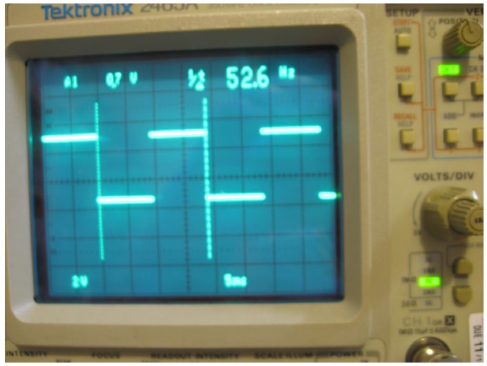 As can be seen on the top Tektronix 2465A scope, the square wave signal – that can be measured at almost every pin of the DIP chip – has a frequency of about 52.2 Hz.