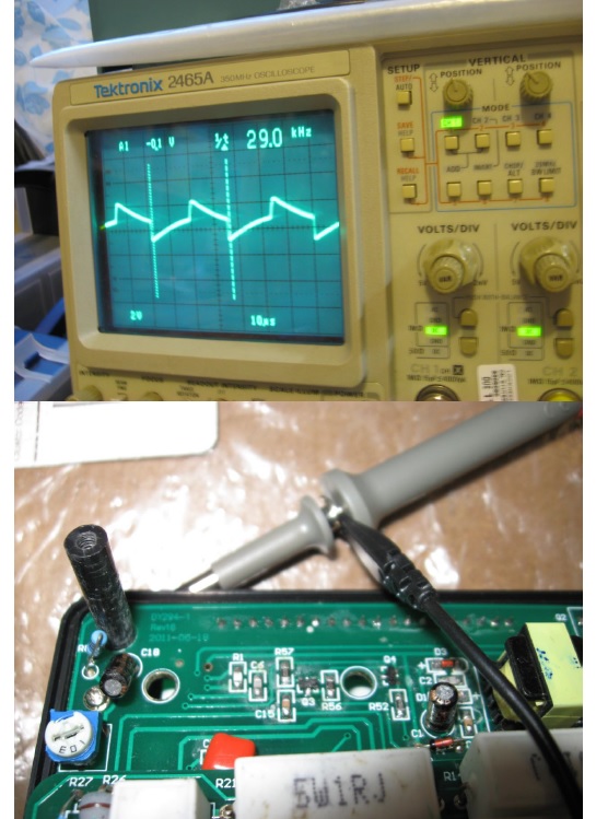 And on my defect DY294 these signals weren’t there at all. So it must be the controller chip that is defect. Possibly from ESD static discharge or whatever reason unknown yet. It couldn’t have been my great soldering skills. I also measured the T1 output signals to D1 and D3. This periodic AC signal was with 86KHz rather high. I knew now that my defect AME7106 controller didn’t oscillate at all, why I didn’t measure any activity at the R1, C6 and R52 components. And why the LCD didn’t work either.