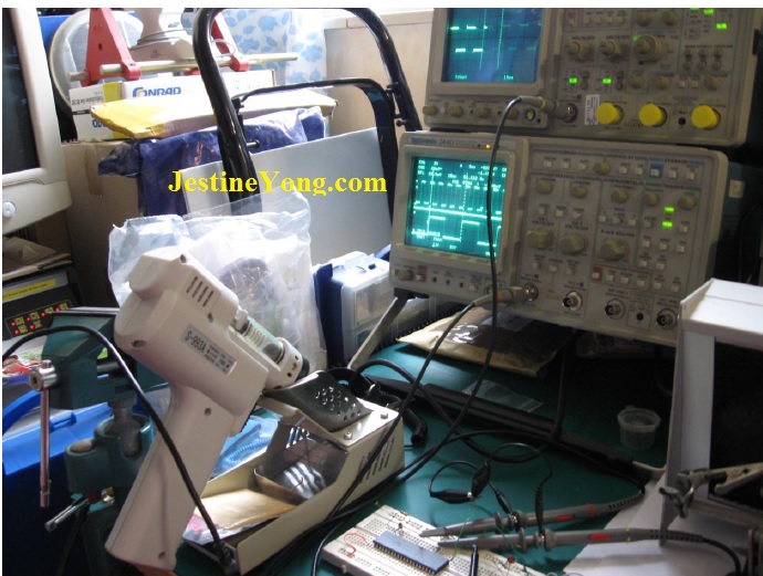 Next photos as proof clearly show that my repair article is correct and complete! As you can see only the already connected CS7106GN pins to the LCD segments of the DY294 are activated! And all signals finally are present (oscillating DY294 chip at last!!) as earlier in this article was shown.
