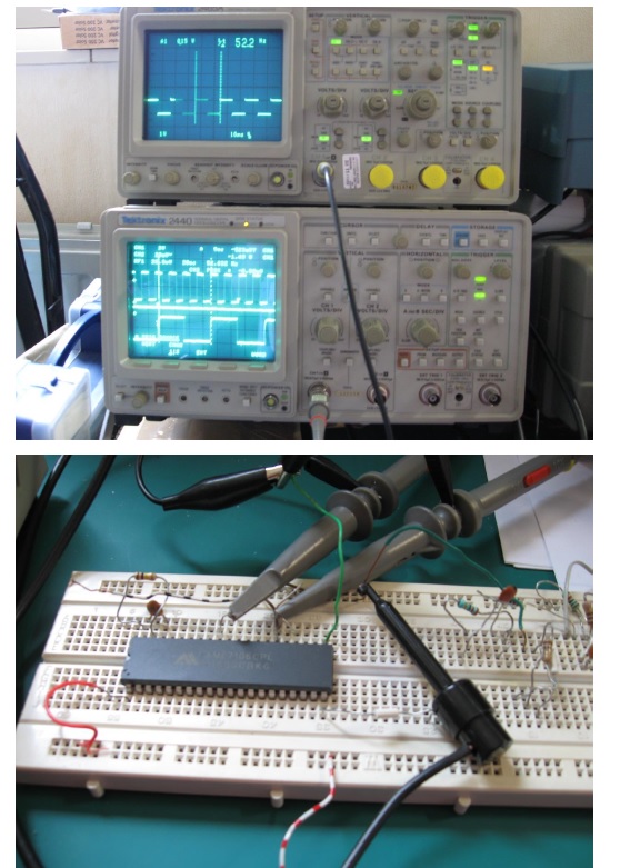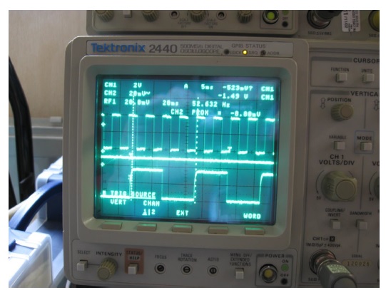 The previous Tektronix 2440 Memory oscilloscope screen shows in the screen below the about 52.632 Hz square wave signal but also the previous in Memory recorded Oscilloscope’s Calibration Square wave in the CRT screen in the top (CH2 unchanged signal, compared to the live CH1 AME chip 52.632 Hz signal).