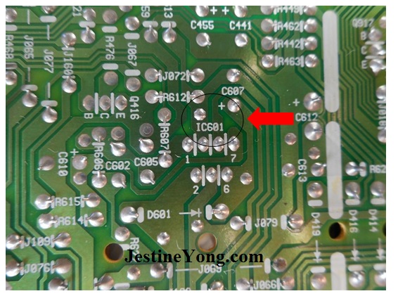 As you can see in the photo above there were some cold joints in the pins of this IC and in the surrounding components as well. Look carefully at the PCB, it is bit darken in the vertical IC area (overheating). All of the vertical IC pins and surrounding components pins were re-soldered with fresh tin.