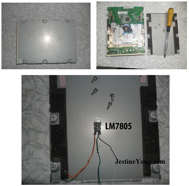 Why need to get a +5 volts Voltage regulator IC LM7805? Because this PC CD Drive need 5 volt and 12 volt to function. The vehicle only supply +12 volts.