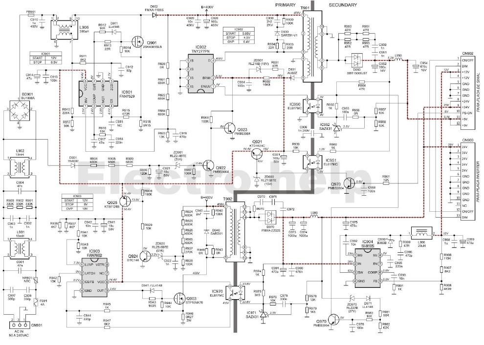 Thanks to the recent 5V standby circuit Tip from Paris from Greece, more of these modern P.F.C. controlled Supplies are likely easily Fixable. Checking the (F)AN4800 or the CM6800 controller Datasheet didn’t help, but checking the TNY277 explained were to look further.