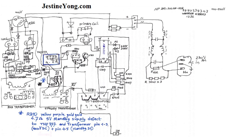 And to give some technical background on this repair I add above schematic with the TNY277 circuit in it.