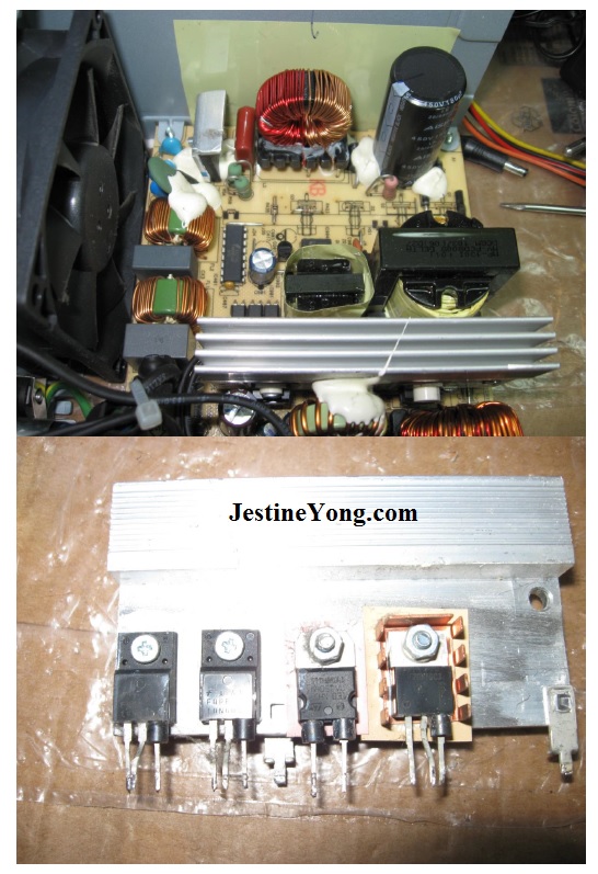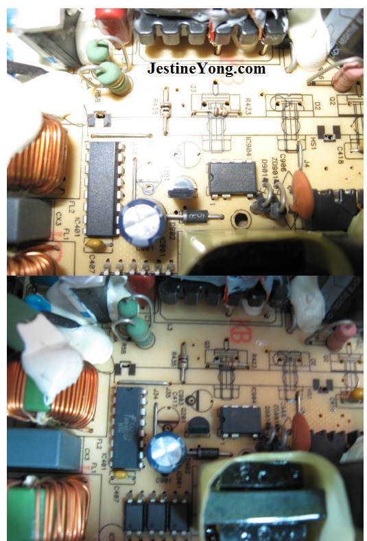 And there was also a vertical placed small Board at the secondary side of this Power Supply, with if I am correct, a LM339 circuit on it. And it is probably just the temperature measuring and speed controlling Board for the Fan. Therefore I didn’t think this Board had any doing in the problem of the Supply. And I had not checked any of the parts of this Board. (See first Photo after this text).