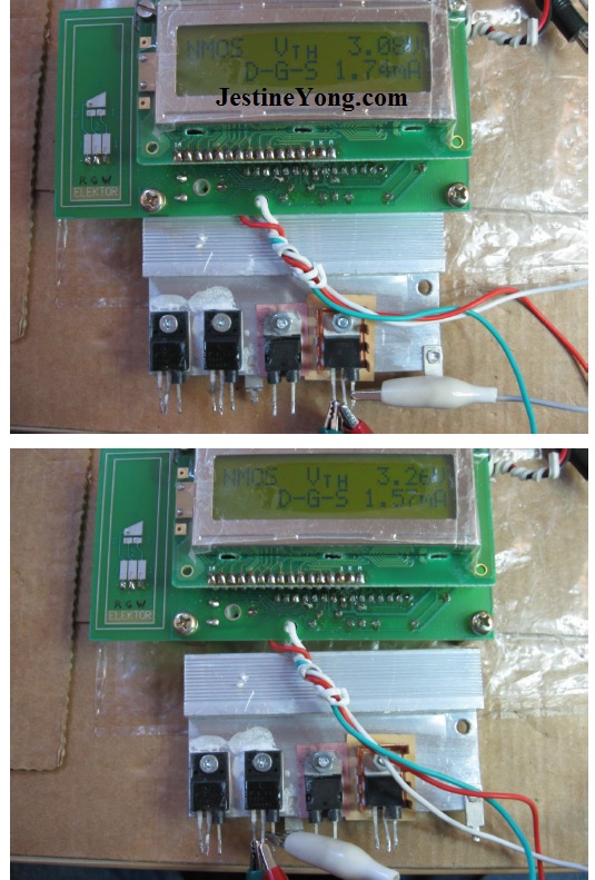 I took from the Semiconductor tests you'll notice that I used 3 different colored krokodil Clips, Red Green and White. And those represent the order of the on the LCD Displayed pinnames. Being