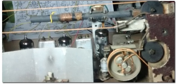 Now the next job was to tie the dial cord! This is a challenge to any technician! Luckily the circuit diagram showed the diagram of this too! But the problem was that the first part of the thin wire was cut to several pieces by rat and I could not find a replacement flexible wire in my stock. We cannot use any copper wire, as it will wear out soon and get cut. So I decided to forgo one part of the guiding outer sleeve, which has very narrow hole, and replaced it with a tough sleeve. May be due to my experience, the whole thing worked just fine with the first attempt itself! We need to ensure that when we turn the tuning spindle left, the needle should move to the left, and vice versa, at the same time ensuring that the Gang opens and closes at the places where the frequencies are marked on the dial! The frequency will be low when the gang is fully closed, so the needle should be at the extreme end where the MW frequency is around 455KC/s (about 450 Meter Band). When the gang is fully open, the needle should be around 1600KC/s (Below 200 Meter Band). When the IFT is tuned to 455Khz at the lowest capacitance, the IFT oscillations will be 50Hz lower than the tuned frequency, preventing overlapping of stations, and preventing howling, whistling etc. Those of you who are interested in learning more about RF/IF and alignment, working etc., please visit this website: http://www.vintage-radio.com/repair-restore-information/valve_alignment.html and http://www.vintage-radio.com/repair-restore-information/valve_if-rf-stages.html