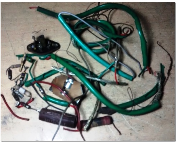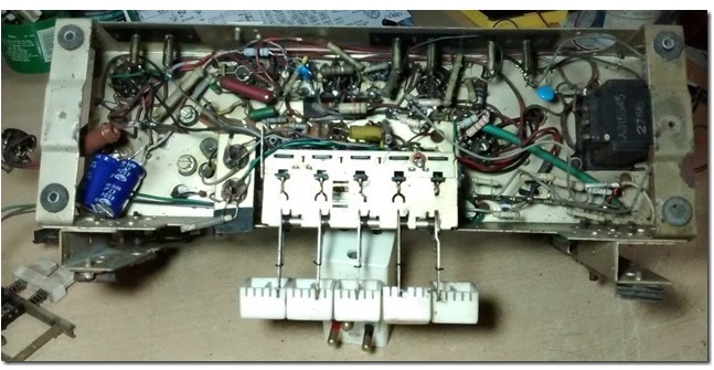 Since, I had the circuit diagram of this model with me, I removed all the hanging rat bitten wires by cutting these at the soldered points. The locking springs of the Bass, Treble and Pick Up Push Button Switches were rusted and spoiled. So I removed these wires also completely deciding to disconnect these. Then removed the valves one by one; EM84 (Tuning Indicator), EZ80 (Double Rectifier), EL84 (Power Amp), EBC81 (PreAmp), EF89 (Intermediate Frequency) and ECH81 (Mixer and oscillator). Cleaned the pins of these valves with metal brush and made it shining. Gently wiped the dust from the valves ensuring that the valve numbers printed on it are not erased. Sprayed WD40 liberally on the valve bases, piano band switches simultaneously pressing the buttons one by one for effecting a self-clean of contact points, volume control, spindle joints of the Gang and its clutch wheels (ensuring that not even one drop goes inside the gang, lest it should affect the capacitance affecting RF frequency range. We should also ensure that it does not enter RF coils) and also the moving wheels of the dial cord. Allowed this to dry off overnight.