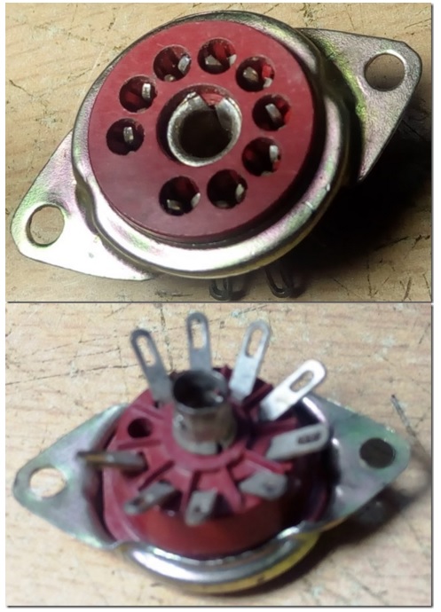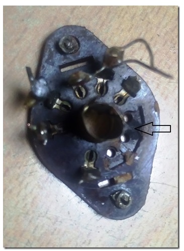 It was arcing only when the voltage was present though there was no continuity on cold test, because there was the dark burn marks between the two pins. This type of valve bases have layers and are very cheap and prone to develop leaks between pins, mainly due to loose contacts at the valve pins. So, replaced the valve base with a new one from my stock, and fixed it with mounting screws, in place of the rivet holes of the old valve base: