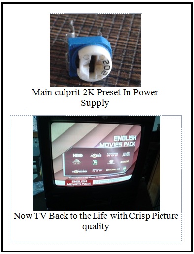 Just for second opinion “I have contacted one of my GURUS” in the same field as per his experience he guided me to just adjust the B+ Voltage in power section and see what is the effect as per his direction I have again started the trouble shooting and on adjusting the preset I do not get any effect so I removed the preset and check it off board. I found this 2K preset was “OPEN” circuit. It was not giving any reading while testing it with my Multimeter hence I replaced it with a new preset and the TV was back to life again.