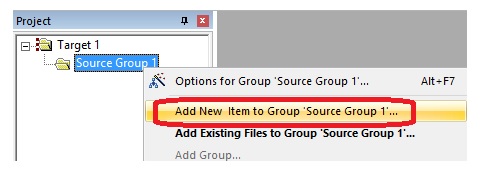 Now just click on the “+” Button on Target and right click on source group and select “add new file to the group”