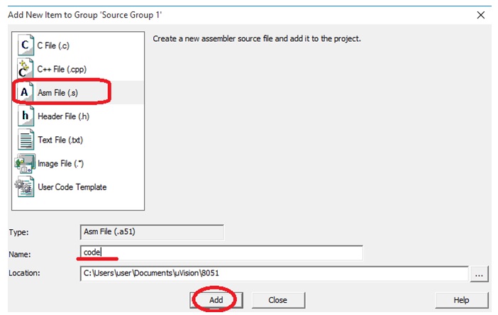 Here it will ask to select the file type that you have to create and file name. If you want to make program in Assembly Language you have to choose “Asm File”, for C Language “C File” and for C++ Language “C++ File”. First we start with Assembly Language. So select “Asm File” and click on “Add” button.