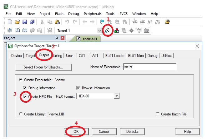 In default software is not selected to create “Hex” file. As we required “Hex” file so we have to configure it. See in figure below.