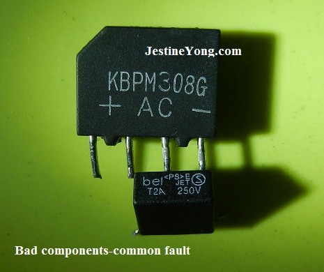 Since my friend is the importer for this product (this is a made in China product) thus he brought along some of the components provided by the manufacturer. The repair was not that difficult because the common fault was a bad bridge rectifier and a fuse. There was a unit with a burnt Varistor and bulged main filter capacitor (10uF 400V). It seems that the power IC is quite robust. The secondary side filter capacitors looked very quality too.