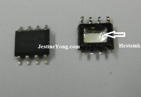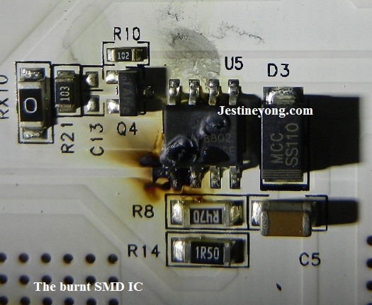 In of the repairs, there was one row of LEDs did not lighted up. Upon inspection found the driver IC AP 8802 burnt and a replacement brought the light back again. This SMD IC AP8802 underneath has a layer of heatsink. You cannot use a normal solder gun to remove it because you may break the IC. You need to use a rework station. Within seconds the IC was easily removed by the hot air from the rework station.