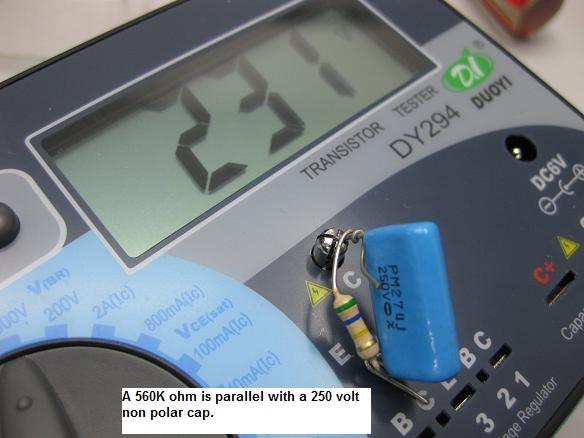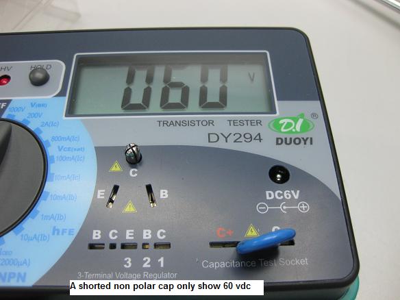 If you need to test on non polar cap that have working voltages that is less than 1000v then you may need to add a resistor in parallel so that the insulation of the non polar would not fail when you pump in the 1000volt to the cap. As for the resistor value you have to find it on your own because the manual does not comes with it. In the photo below, i found that the resistor of 560kOhm is suitable to test on a non polar cap that have 250 volt working voltage. If you use a lower ohm value the non polar cap insulation may breakdown. From the same photo you could see that the max voltage only hit 231 volt. If this non polar cap insulation have problem, the value could be less than 100volt.