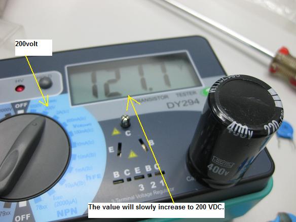 For your information, this meter is not design to test on the ESR or the capacitance value of e-caps. It test just the same way for a non polar cap. Just insert the e-cap into the respective section and select 200 VDC as shown in the photo and press the Test button. The LCD display will show the capacitor is charging and it will charge up to 200vdc-make sure that you are testing a cap that have working voltage higher than 200 volt. The disadvantage of this test is you have to wait for the cap to charge up.