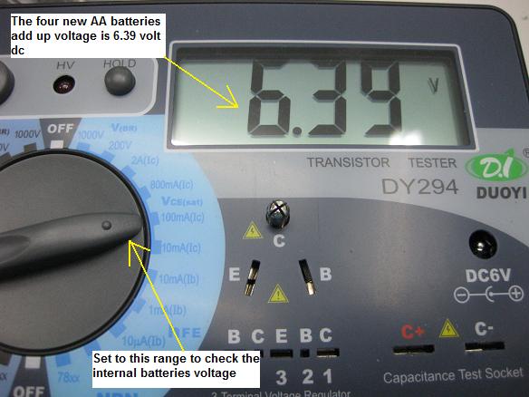 Last week i was busy with the repair course and holiday and finally today i could review the meter. The DY294 Digital Transistor Tester is using 4 pcs of AA batteries and and this tester can be used to test on many type of components. Select to the range as shown in the photo below and you will know the total voltage of the internal batteries: