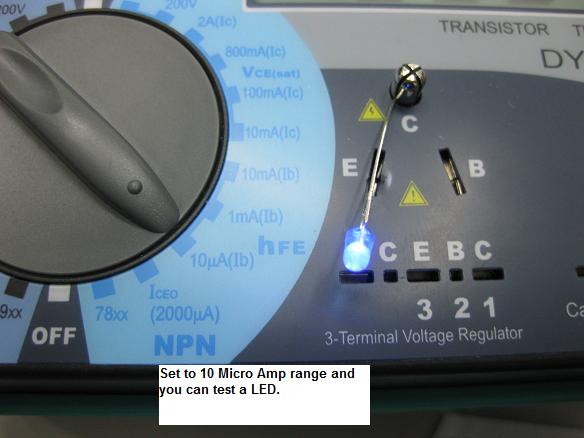 Certain types of LED can’t be test using analog meter like the one use in the Blue ESR meter. However this meter can be used to test on many different types of LED. Just set the meter to few different ranges and you could see the LED will light and the intensity of the light is depends on which range that you have selected.