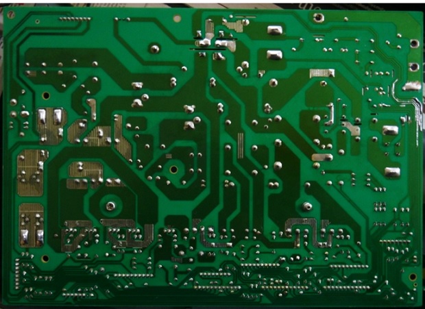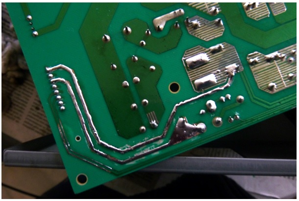 Here also, as you can see above, there were three more corroded foil tracks which I repaired by applying a layer of fresh solder tin on them again. I did the same at its back side. I refreshed all the solder joints of it and put a layer of tin in these parts on the right side of it where the thick ground foil track is.